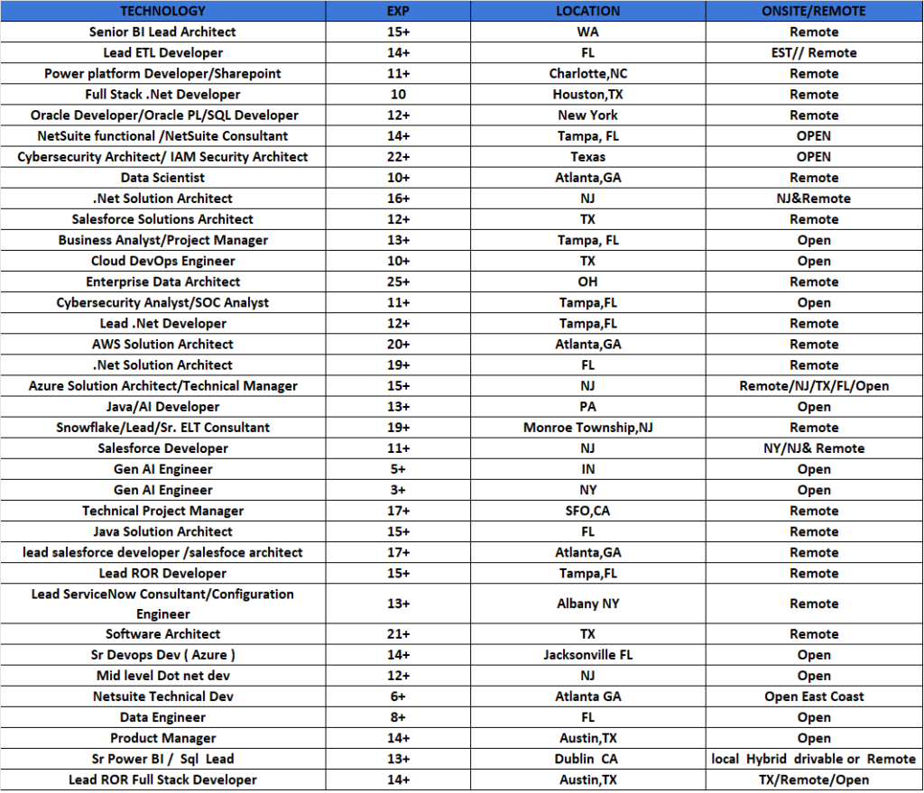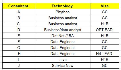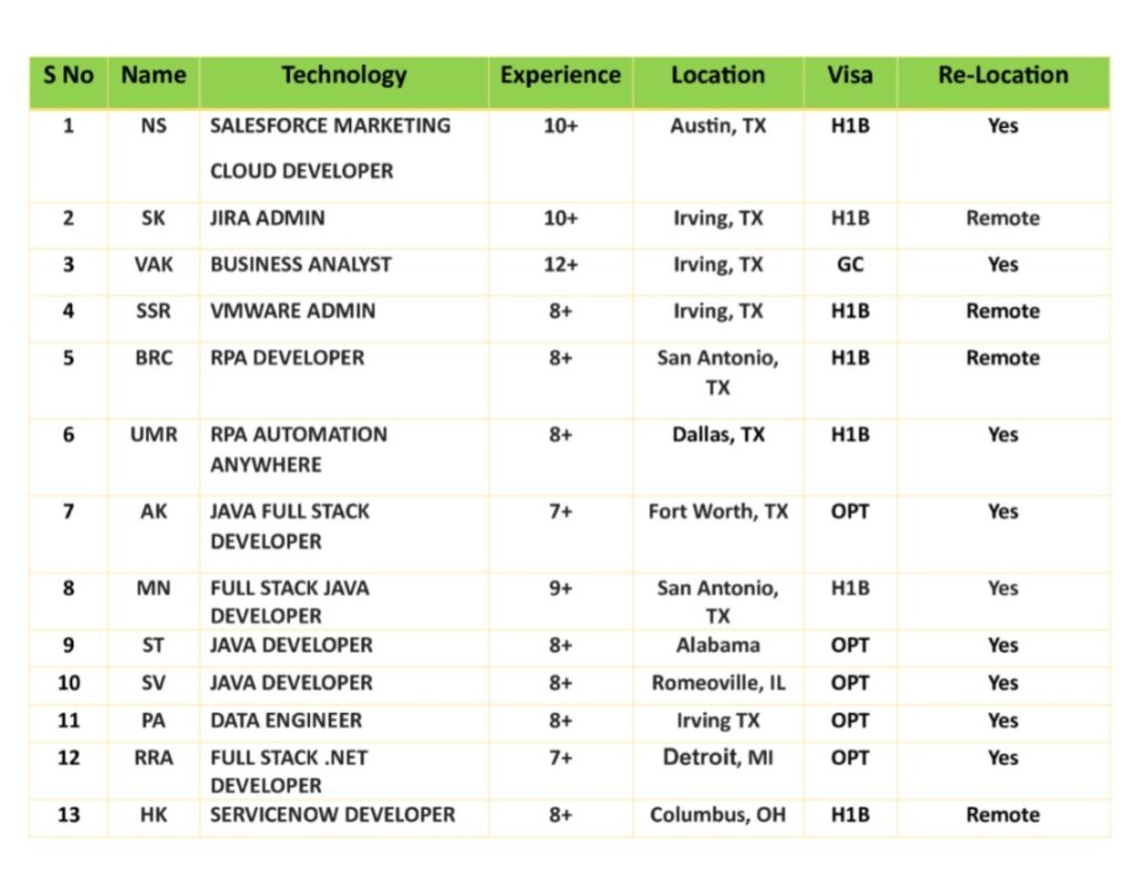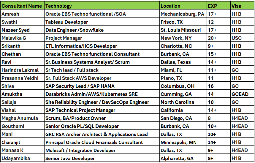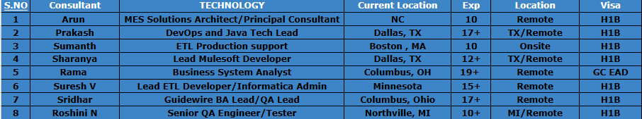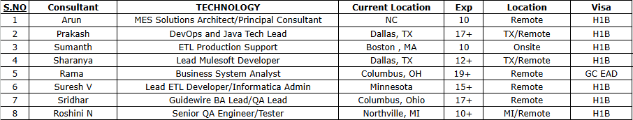 Hi, Greetings!! This is Swapna from Clear Thought Solutions LLC. Please find below top-notch consultants who are actively looking for new projects immediately on C2C basis. Please let me know your interest in any of the below candidates. Kindly add my email swapna.i@clearthoughtsolutions.com in your distribution list and share your daily C2C requirements. Please feel free to contact: 919-589-7952