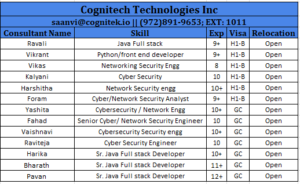 We have the following skilled IT candidates on our Bench, please let me know if you have any Contract or Contract to Hire requirements relevant to their technologies. Looking forward to work with you and your company, If possible, please refer or do add me to your distribution list for future business.