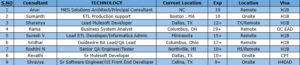 | 2 | Sumanth | ETL Production support | Boston , MA | 10 | Onsite | H1B |